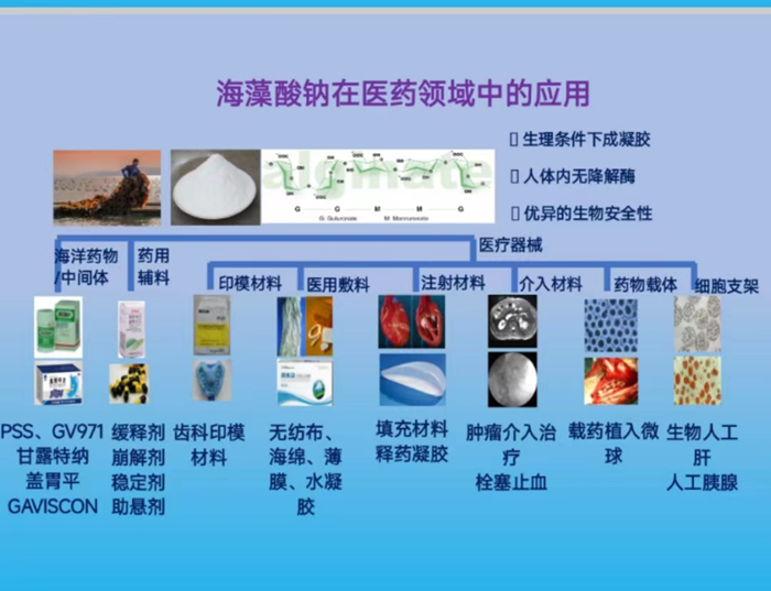 張德蒙博士主要從四個方面展開介紹:海藻酸鈉是從海帶等褐藻中提取的一種天然多糖,已廣泛應用于食品、化妝品及醫藥等領域,可用作海洋藥物原料及中間體,如降血脂藥藻酸雙酯鈉PSS、抗老年癡呆藥971;可用作口服藥物的緩釋劑,如普瑞巴林緩釋片、硝苯地平控釋片。