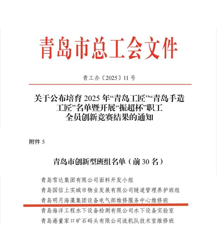 日前,青島市總工會發布《關于公布培育2025年“青島工匠”“青島手造工匠”名單暨“振超杯”職工全員創新競賽結果的通知》。在評選出的30個“青島市創新型班組”中,明月海藻集團設備電氣部維修服務中心維修班憑借卓越的創新實踐能力成功入選,榮膺該稱號!